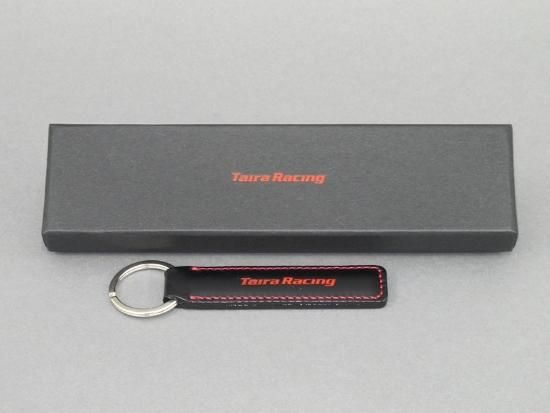 TairaRacing型押しロゴ入りオリジナルキーホルダー。レッドのロゴ&ステッチ入りでお洒落な仕上がり。